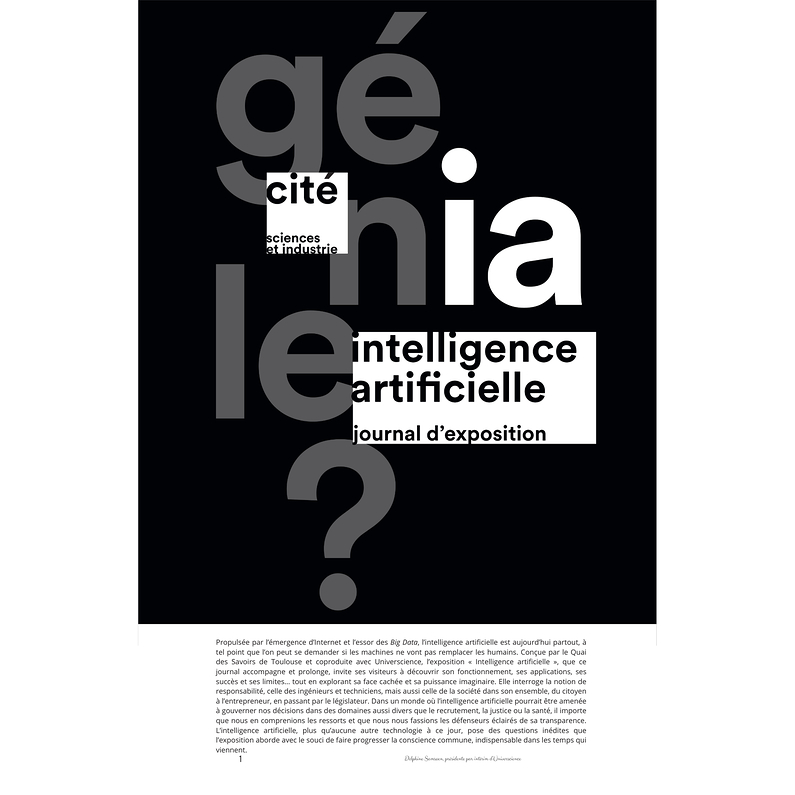 Designed as a souvenir of the exhibition, this journal focuses in six chapters on the different dimensions of artificial intelligence that are revolutionizing the organization of work and creativity in our societies. The culmination of more than 70 years of research, it has seen astonishing progress, such as deep learning for machines. So much so that the fear of tens of millions of jobs being replaced by automation, promising unlimited benefits, haunts the world of work. However, from another perspective, artificial intelligence can prove to be an ally in the face of environmental challenges. This in no way prevents us from defining the proper and essential use of personal data to protect humans in the age of AI. In the field of creation, artists and authors are affected by the question of the status of works generated by AI. Finally, a timeline featuring 24 key dates in the history of artificial intelligence from its origins to the present day provides historical context for understanding this technological revolution, from the early days of what would become computer science to the intersection of mathematics, economics, and cognitive science.
