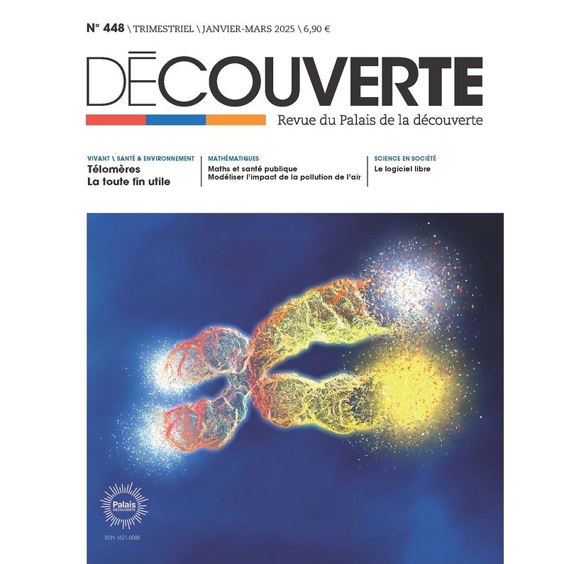 Ce numéro 448 de Découverte fait un focus sur les télomères, au cœur des recherches sur le vieillissement et le cancer. Éclairage sur les logiciels libres, moteurs collaboratifs d'innovation numérique, offrant une alternative aux logiciels propriétaires. Également, un dossier consacré à la modélisation de la pollution de l'air, pour mieux comprendre et réduire les impacts sanitaires et environnementaux. Enfin, une escapade culturelle nous emmène au musée Curie à Paris. Bonne lecture !